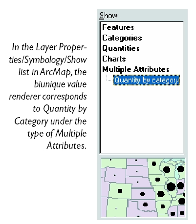See BiUniqueRenderer for more information about how IBivariateRenderer can be implemented. This renderer corresponds to the "Quanity by category" layer symbology option in ArcMap.