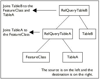 For example, if you wanted to join two tables to a feature class, you would first create RelQueryTableA to join one of the tables to the feature class. You would then create RelQueryTableB to join the second table to RelQueryTableA. RelQuerytableA would be the source for RelQueryTableB. The diagram below illustrates how this works.